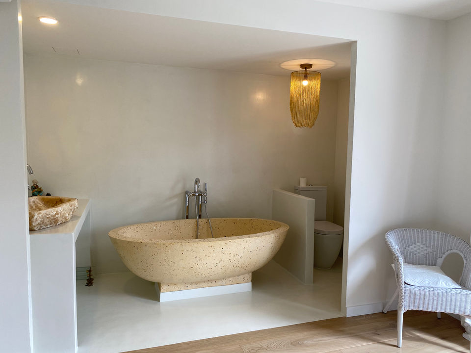 Los baños, con sus muebles integrados, duchas dobles y bañeras de microcemento, reflejan un diseño vanguardista que apuesta por la pureza de las formas y la continuidad visual. Cada espacio transmite una sensación de amplitud y serenidad, donde la ausencia de juntas y la textura del microcemento crean un ambiente sofisticado y acogedor.